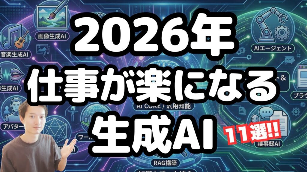動画生成AI 【日本語を喋る動画を作れる】最新の動画生成AI「Seedance 1.5 Pro」で映画品質の音声付き動画を無料で作る! ◆動画の説明 ByteDanceのA... 管理人1月 8, 2026 生成AI活用術 【2026年】仕事が楽になる最強AIツール11選! 2026年に絶対に使って欲しい仕事が... 管理人1月 8, 2026